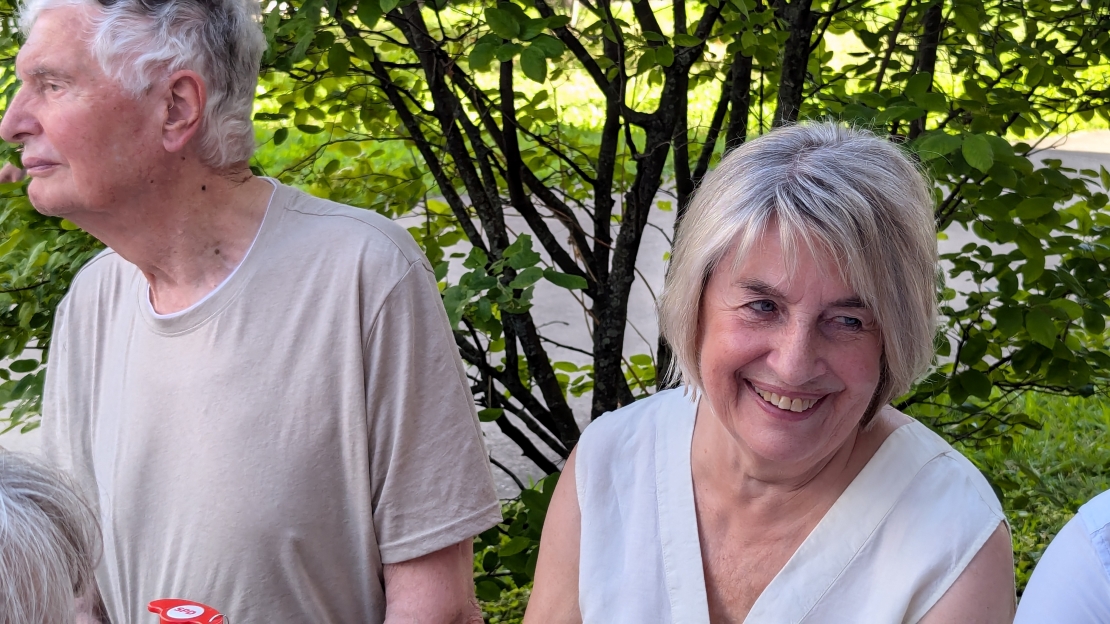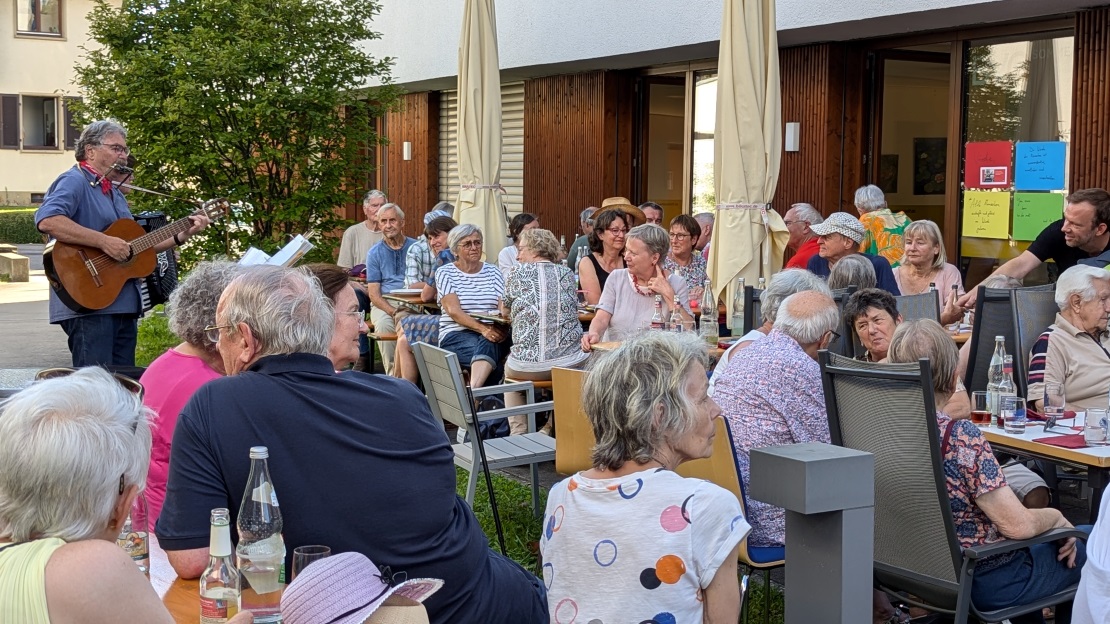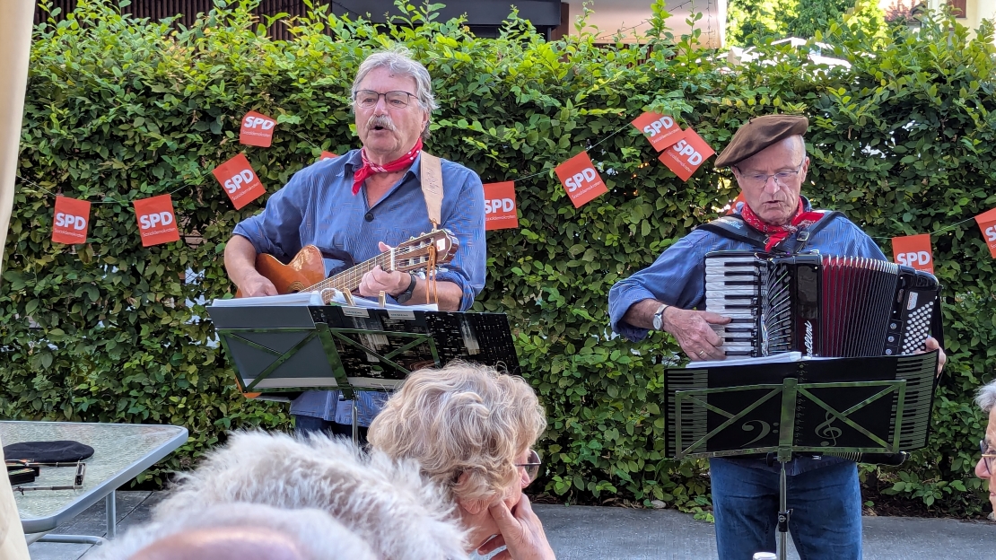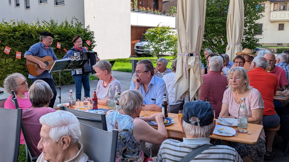 Weit mehr als 50 Mitglieder, Freunde und Nachbarn beim SPD-Sommerfest freuten sich die beiden Vorsitzenden der Denzlinger Sozialdemokraten, Elfriede Behnke und Björn Reuter am Samstag vergangener Woche. In diesem Jahr fand dieses traditionelle Ereignis erstmals im Quartierstreff Sommerhof statt, ein – wie sich herausstellen sollte – idealer Ort für derartige Zusammenkünfte, insbesondere bei derartig hohen Temperaturen und fabelhaftem Sonnenschein, der auch noch lange nach Eröffnung um 17 Uhr dominierte. Durchgängig im Schatten gelegen und ein grüner Rasenstreifen vor der Terrasse verhinderten, dass wegen der übermäßigen Hitze vorzeitige Fluchtversuche unternommen wurden. Schon kurz nach der Eröffnung durch Elfriede Behnke begannen an allen Tischen und Bierbänken angeregte Unterhaltungen, unterbrochen von hervorragenden musikalischen Beiträgen durch „Hanz und Franz“, einem charismatischen Duo aus der mittelbadischen Weingegend um Oberkirch herum, die unter großem Beifall mit politischen Songs vorwiegend aus der badischen Revolution, aber auch mit heimatlichen Mundartliedern und Oldies die Gesellschaft zum Mitsingen und Tanzen animierten.