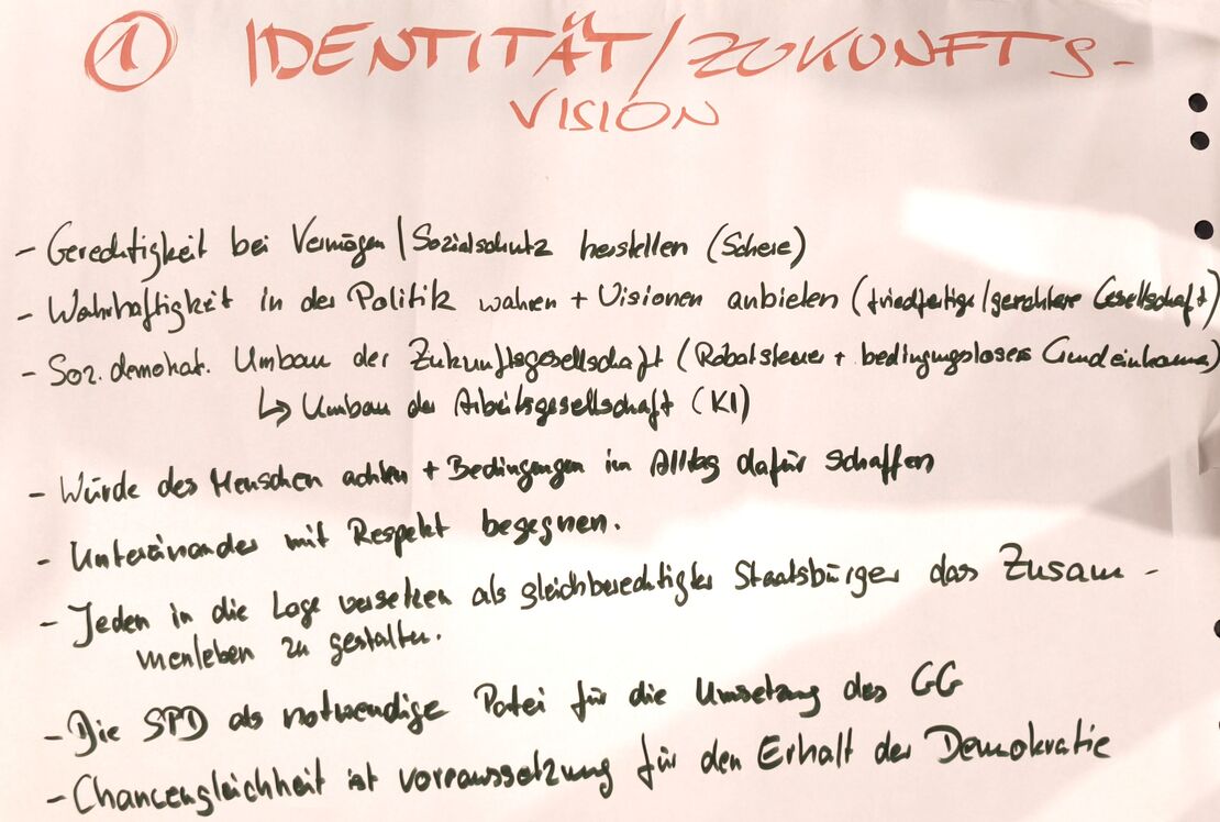 Nach dieser Generaldebatte beschäftigten sich vier Arbeitsgruppen intensiv mit der Frage, wie die SPD aus ihrer derzeitigen Krise kommt. Die Ergebnisse wurden anschließend im Gremium vorgestellt, gemeinsam diskutiert und der Vorstand mit der weiteren Ausarbeitung und Vorstellung in den Parteigremien beauftragt. Einig war man sich, dass soziale Gerechtigkeit, ein schützender Sozialstaat und Chancengleichheit zur sozialdemokratischen DNA gehören und Voraussetzungen für den Erhalt unserer Demokratie sind. Die SPD soll sich für Wahrhaftigkeit in der Politik einsetzen und Visionen für eine friedfertige und gerechtere Gesellschaft anbieten. Angestrebt wird ein sozialdemokratischer Umbau der Zukunftsgesellschaft. Auf die durch Digitalisierung, Robotik und Künstliche Intelligenz aufgeworfenen Veränderungen der Arbeitswelt müssen sozialverträgliche Antworten gefunden werden.