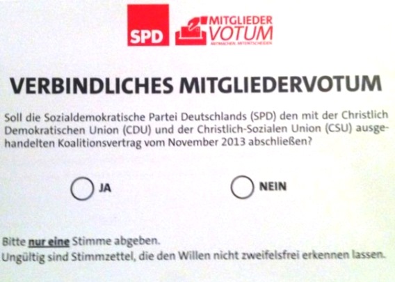 Das Mitgliedervotum der SPD ist beendet. Knapp 78% der SPD-Mitglieder nahmen an der Befragung teil. Fast 76% sprachen sich für Koalition zwischen CDU/CSU und SPD aus.